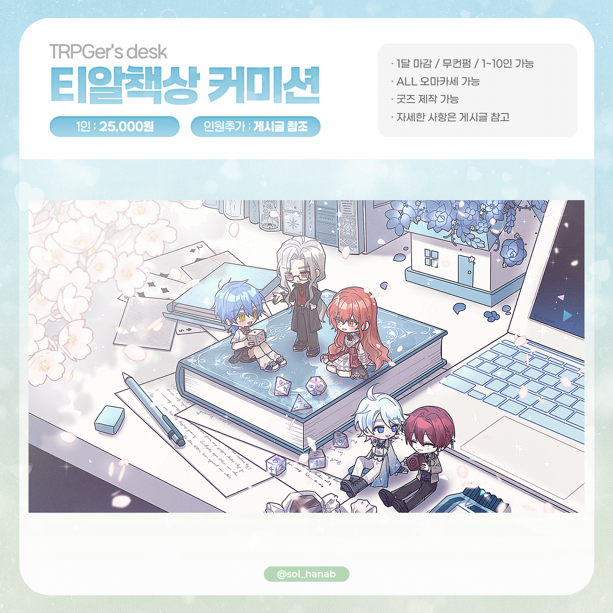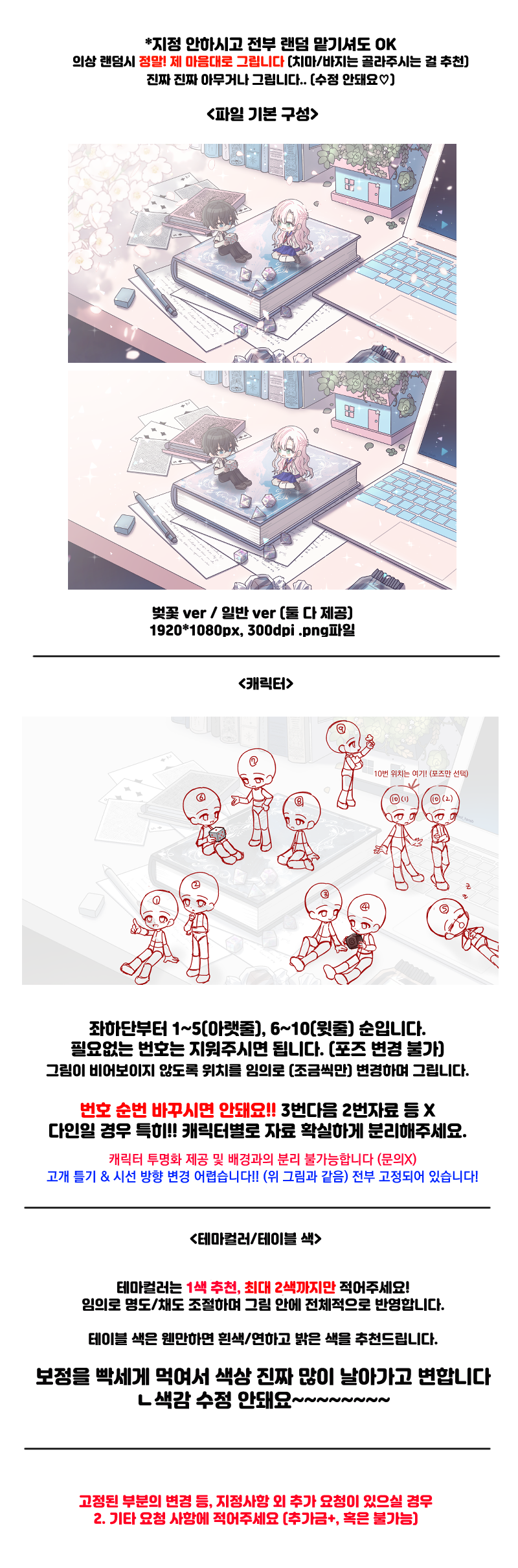 3.사용처, 마감기한 (필요시에만 작성) 프로필 이미지, 커플 사이트, 웹사이트에 재업로드 등 비상업적 용도 이용, 소량 굿즈 제작 (굿즈 제작에 대한 내용은 커미션 게시글을 참고) ↑ 의 사용처를 벗어날 경우에만 적어주세요! (비우실 경우 위 사항을 벗어나지 않는 개인적 사용으로 이해)