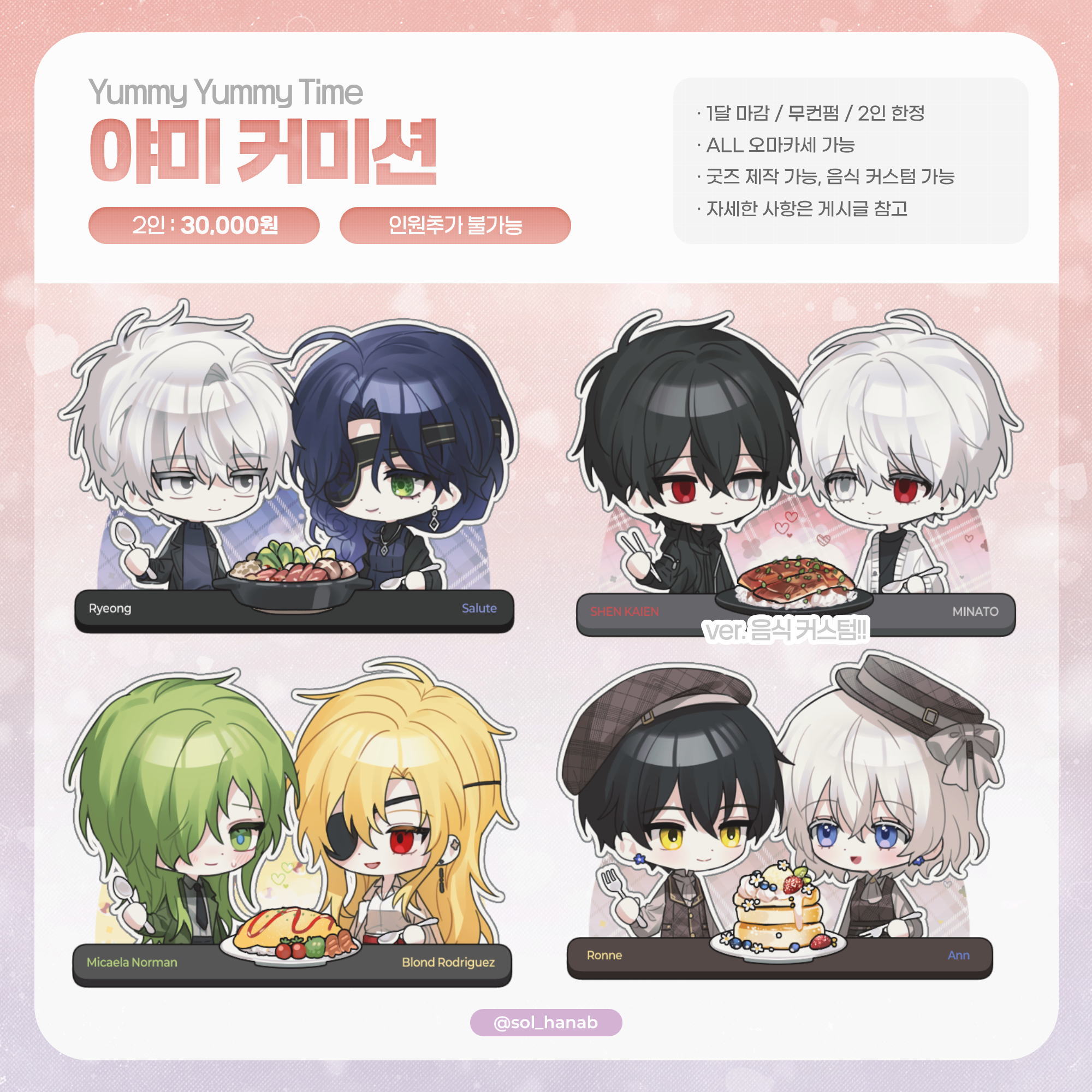 3.사용처, 마감기한 (필요시에만 작성) 프로필 이미지, 커플 사이트, 웹사이트에 재업로드 등 비상업적 용도 이용, 소량 굿즈 제작 (굿즈 제작에 대한 내용은 커미션 게시글을 참고) ↑ 의 사용처를 벗어날 경우에만 적어주세요! (비우실 경우 위 사항을 벗어나지 않는 개인적 사용으로 이해)