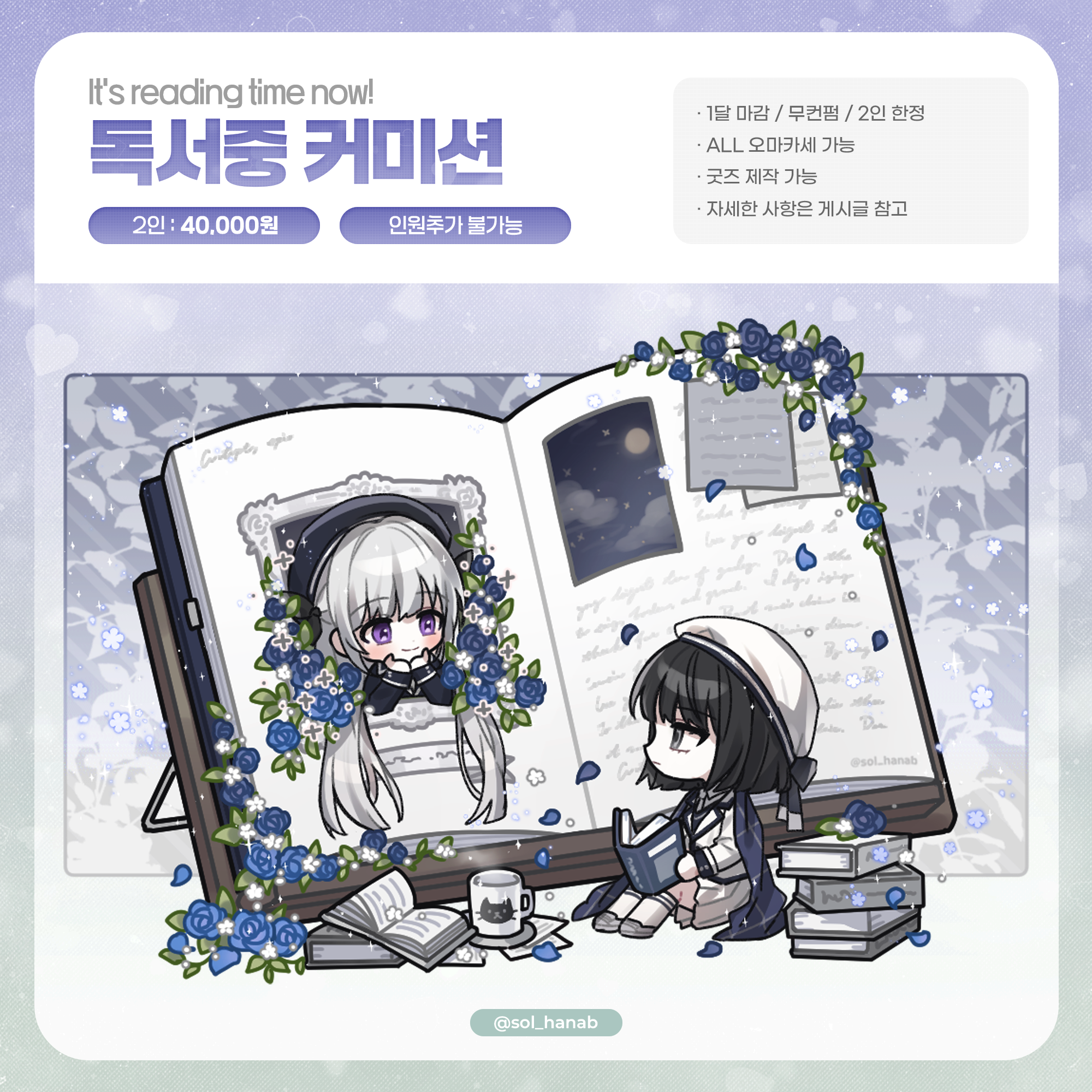 3.사용처, 마감기한 (필요시에만 작성) 프로필 이미지, 커플 사이트, 웹사이트에 재업로드 등 비상업적 용도 이용, 소량 굿즈 제작 (굿즈 제작에 대한 내용은 커미션 게시글을 참고) ↑ 의 사용처를 벗어날 경우에만 적어주세요! (비우실 경우 위 사항을 벗어나지 않는 개인적 사용으로 이해)